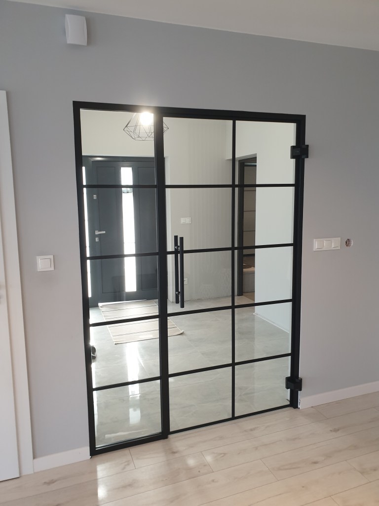 Konstrukcje mogą być minimalistyczne – wykonane ze szkła bezbarwnego lub matowego na samych zawiasach – albo w modnym stylu loftowym z profilami.