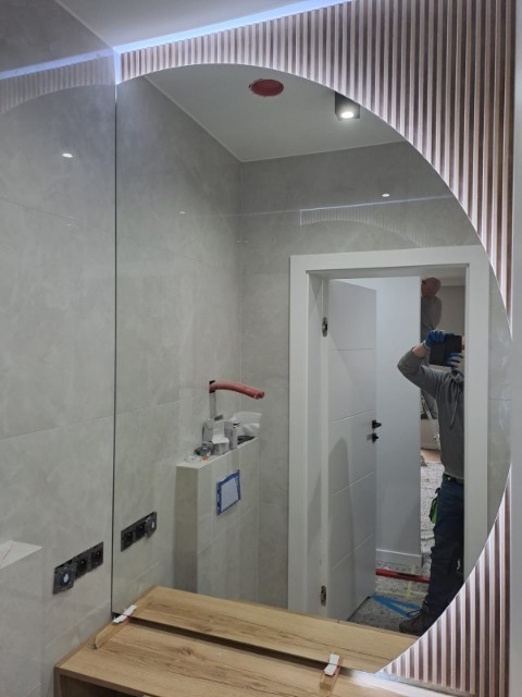 - Wycięcie fragmentu tafli pod szafkę (też ryzykowne, bo mocne wyjęcia osłabiają lustro i mogą utrudnić transport i montaż).